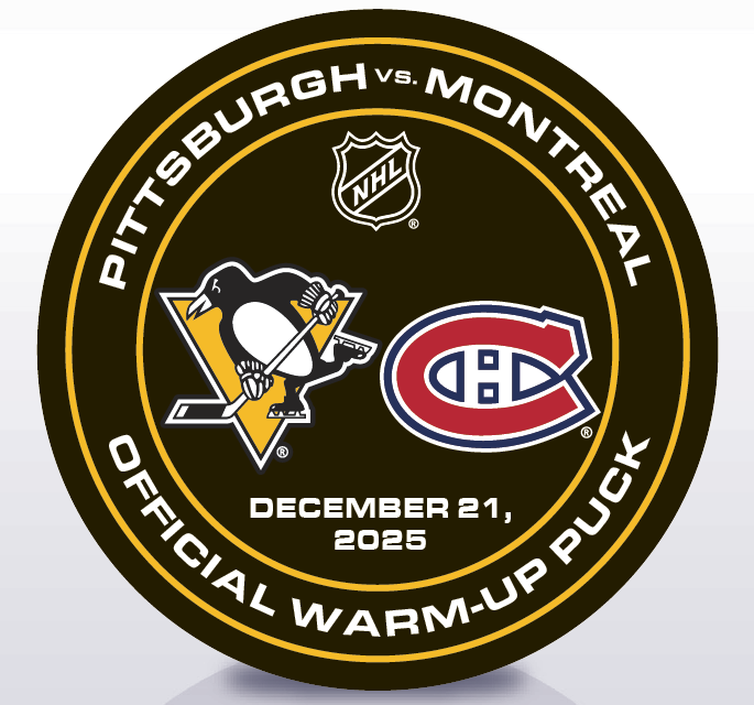 Purchase your Crosby All-Time Commemorative Puck, game-dated and replicating those used on the ice during warmups on December 21, 2025, between the Pittsburgh Penguins vs. the Montreal Canadiens, marking the date Sidney Crosby recorded 1,724 points, surpassing Mario Lemieux to become the Penguins' all-time points leader.