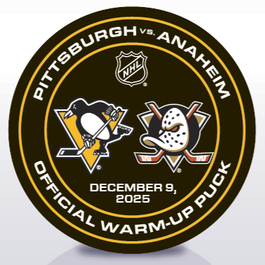 Purchase your Official Pittsburgh Penguins Warm-Up Puck used on the ice during pre-game warm-ups at PPG Paints Arena on December 9, 2025 between the Pittsburgh Penguins vs. Anaheim Ducks. This item includes an Official Penguins Puck case.